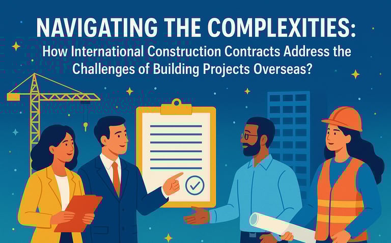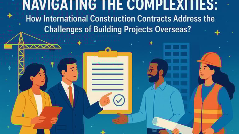 How do international construction contracts handle the special challenges of building projects overseas?