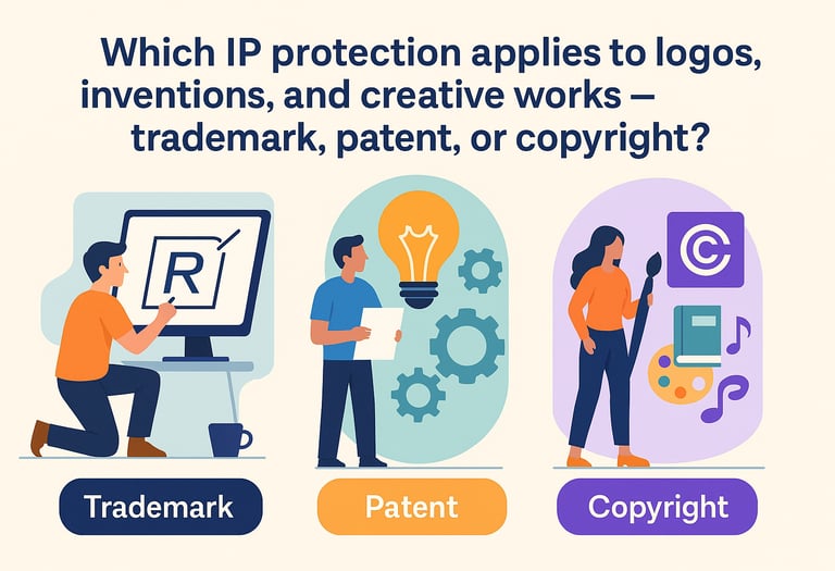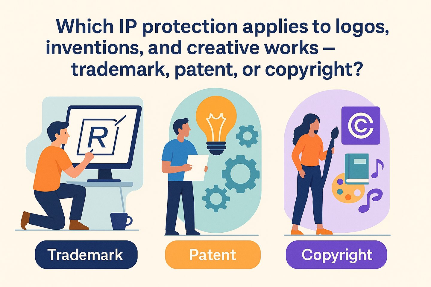 Which IP protection applies to logos, inventions, and creative works — trademark, patent, or copyright?